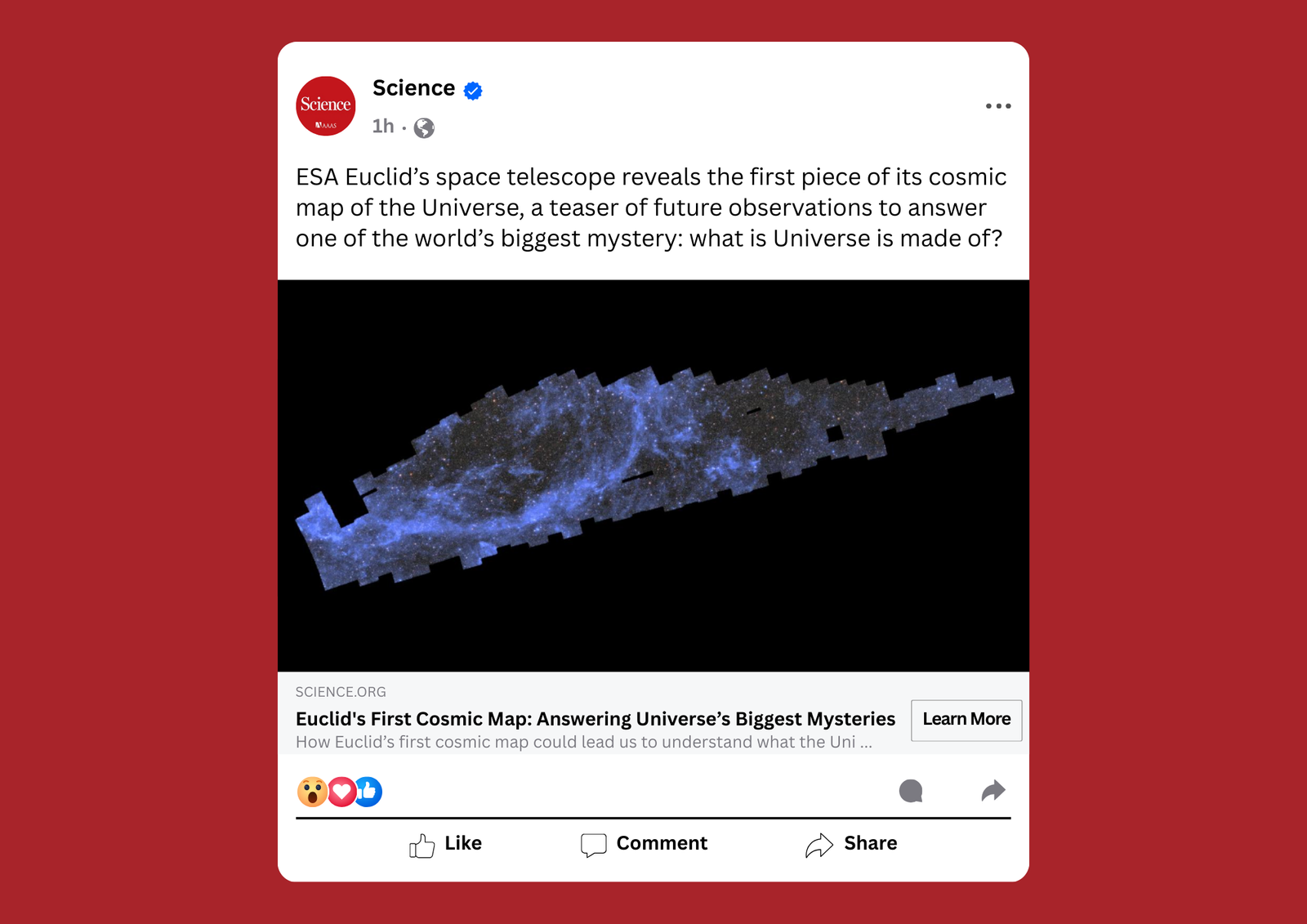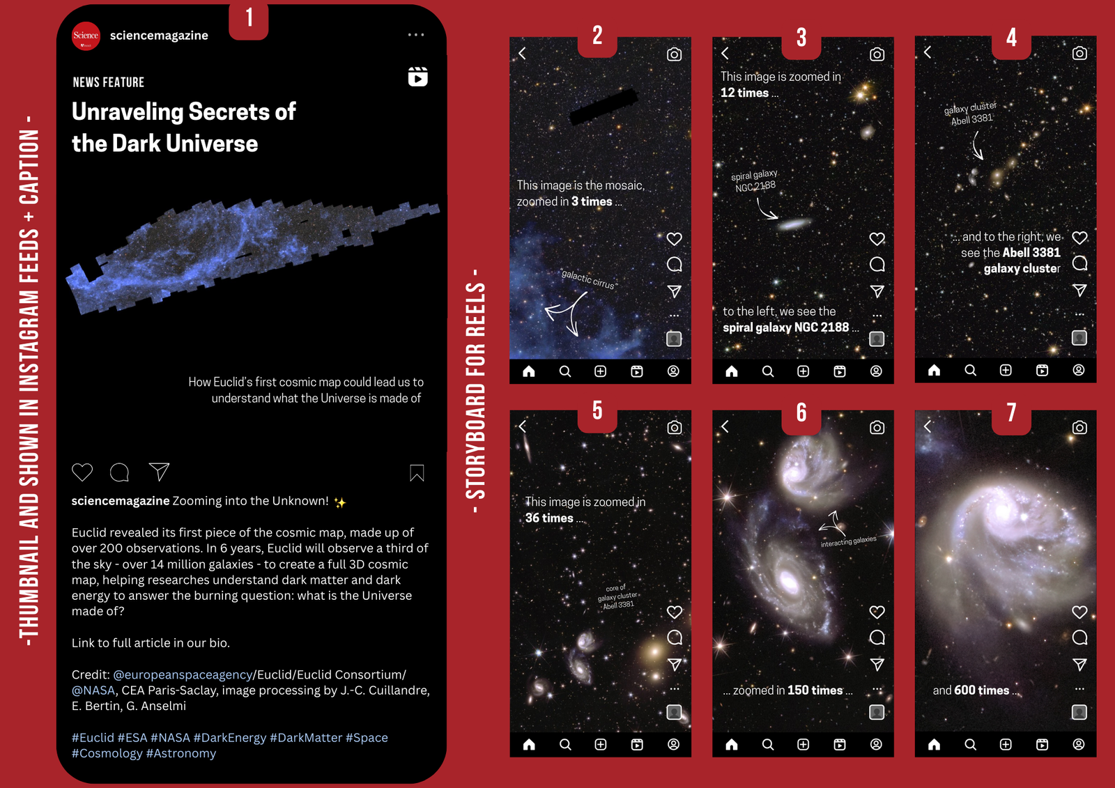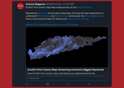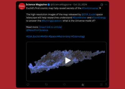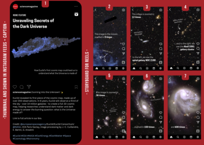 I wrote a news feature for science-interested audience of a science news website (e.g., Science.org). The feature highlights the first cosmic map by Euclid space mission and unravels the history of the mission and how it came to be. This was part of the “Practical Science Writing” module. Additionally, the social media campaign was part of the “Digital Media Skills for Science Communication” module. Here, I focused on its 3 largest platform; Instagram, Facebook, and X/Twitter, with an additional upcoming platform, BlueSky. “All accounts mentioned and used in the mock up are for educational purposes only.”